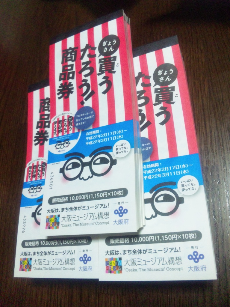 大阪まるごと大売出しキャンペーン事業として、現在大阪府で発売されている「1万円で1万1500円分使える商品券」、ぎょうさん買うたろう!商品券を買ってみました。