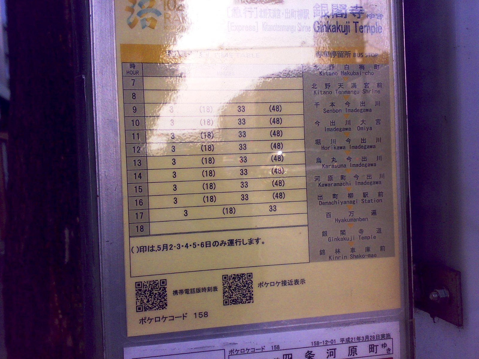 いつの間にか、北野白梅町のバス停の時刻表がさしかえられてました。
